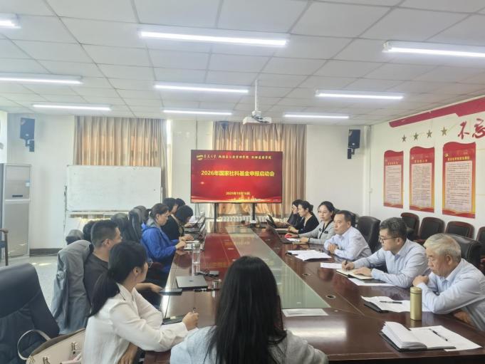 在金家岭校区2号实验楼214会议室举行国家社科基金申报经验交流暨2026年基金申报启动会。院党委书记尹文博、副院长韩庆娜、王猛及申报教师和指导专家参加会议。会议由韩庆娜副院长主持。